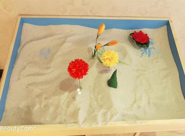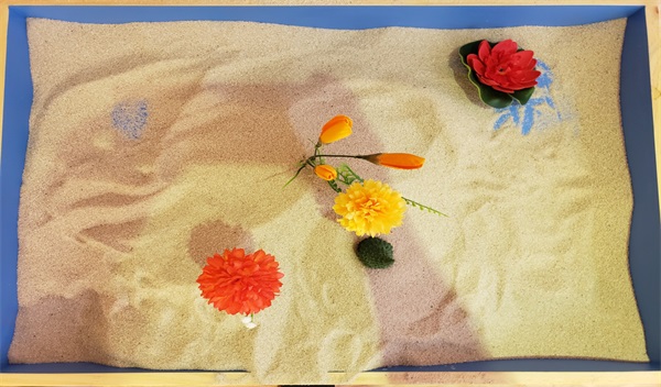 水和莲花摆放在沙盘框边缘——表现自我的恐惧和不安,反应某一时段相对严重的心理创伤。